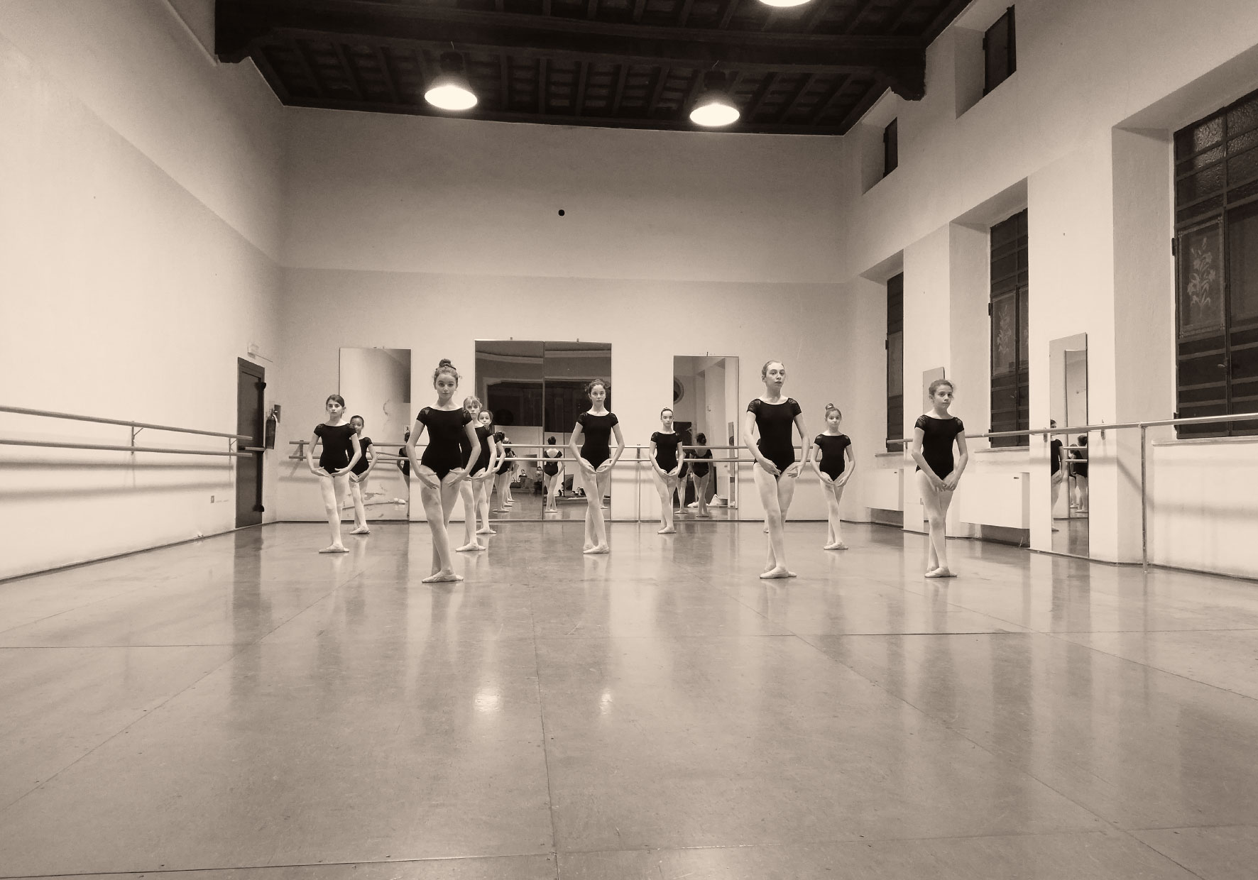 Entrambe le sale danza sono dotate di sbarre fisse e mobili, tappetini e attrezzi adatti alle nostre attività; il pavimento è in parquet elastico per prevenire infortuni, rivestito di tappeto danza professionale Arlequin (sala al primo piano).